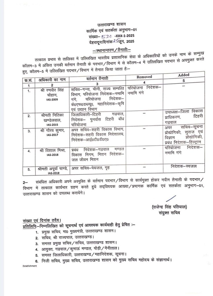 भारतीय प्रशासनिक सेवा के अधिकारियों की स्थानान्तरण / तैनाती सूची जारी