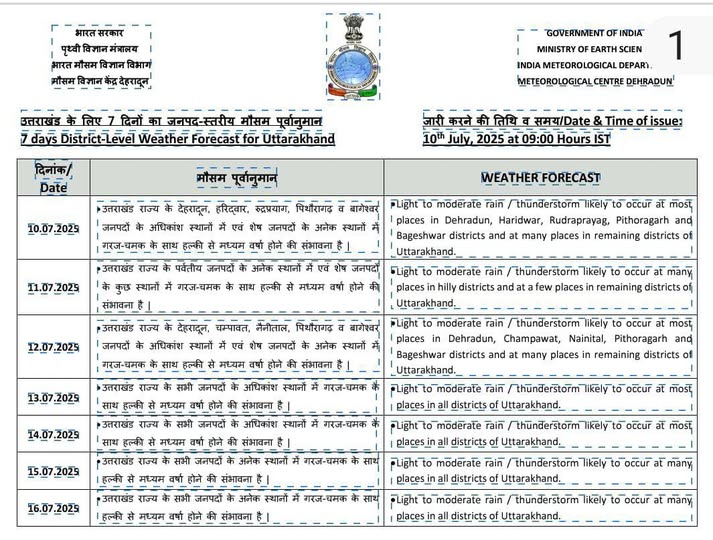 देहरादून: मौसम विज्ञान केंद्र ने उत्तराखण्ड के लिए सात दिन के मौसम का पूर्वानुमान जारी किया।
