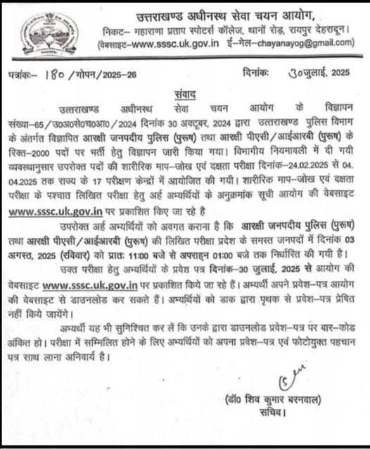 देहरादूनः उत्तराखंड पुलिस विभाग में कांस्टेबल के 2000 पदों पर भर्ती के लिए शारीरिक परीक्षा में सफल हुए अभ्यर्थियों की लिखित परीक्षा 03 अगस्त 2025 को आयोजित की जाएगी। यह परीक्षा उत्तराखंड अधीनस्थ सेवा चयन आयोग (UKSSSC) द्वारा आयोजित की जा रही है।