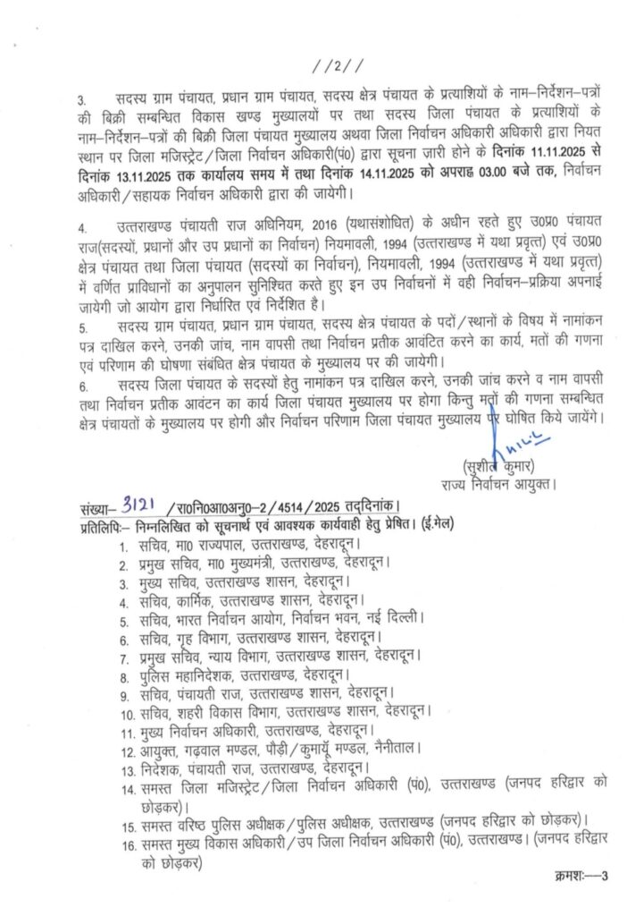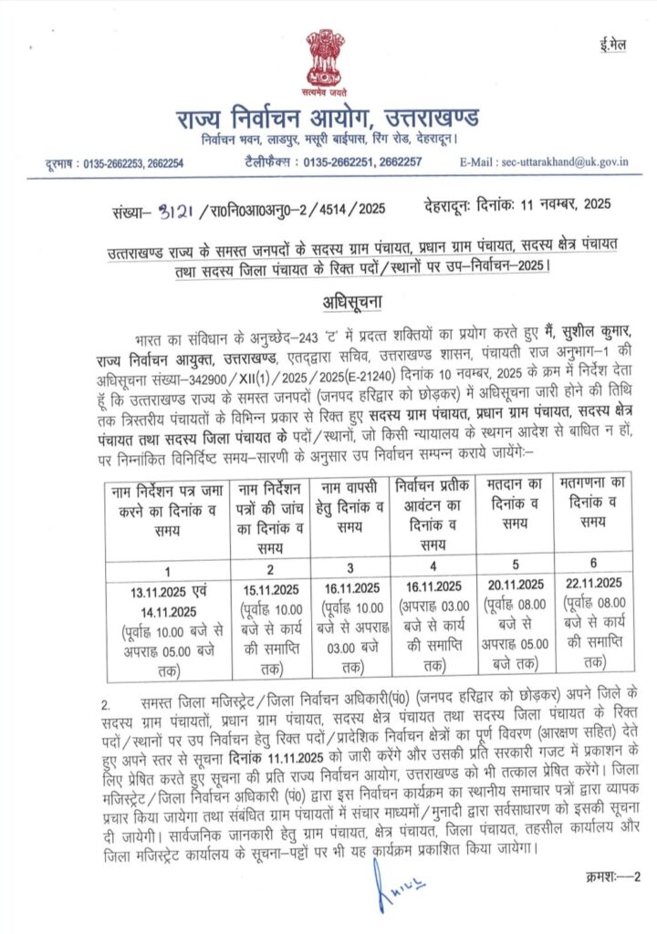 देहरादून: उत्तराखंड राज्य के हरिद्वार जिले को छोड़कर शेष 12 जनपदों में त्रिस्तरीय पंचायती राज व्यवस्था के रिक्त पदों को भरने के लिए राज्य निर्वाचन आयोग ने उप-निर्वाचन-2025 की विस्तृत अधिसूचना जारी कर दी है। इन उप-चुनावों के माध्यम से ग्राम पंचायत सदस्य, प्रधान ग्राम पंचायत, सदस्य क्षेत्र पंचायत, तथा सदस्य जिला पंचायत के रिक्त पदों को भरा जाएगा।