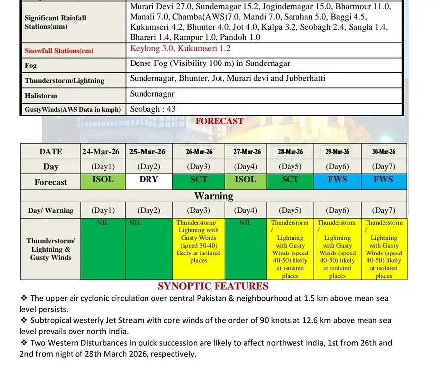 27 मार्च को भी प्रदेश में मौसम खराब रहने की संभावना जताई गई है, हालांकि इस दिन किसी तरह का अलर्ट जारी नहीं किया गया है। इसके बाद 28 से 30 मार्च के बीच एक और वेस्टर्न डिस्टरबेंस पहले से ज्यादा सक्रिय रहेगा। इन तीन दिनों के दौरान ऊंचाई वाले इलाकों में बर्फबारी और अन्य क्षेत्रों में बारिश होने की संभावना है। साथ ही मैदानी और मध्यवर्ती इलाकों में 40 से 50 किलोमीटर प्रति घंटे की रफ्तार से आंधी चलने और बिजली गिरने का येलो अलर्ट जारी किया गया है।